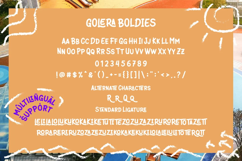 Golera Boldies is a bold hand-drawn sans serif font with brush-style strokes, rich ligatures, and alternates. Perfect for branding, posters, logos, and creative display typography.